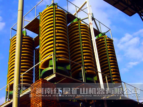 螺旋溜槽因功耗低,結構簡單,占地面積少,操作簡易,選礦穩定,分礦清楚,無運動部件,便于維護管理,單位面積處理量大等特點在眾多重選設備中 受關注。螺旋溜槽有較寬和較平緩的槽面,礦漿呈層流流動的區域較大,更適于處理中細(-4mm)粒級的礦石。我國已制成直徑為400、600、900、1200mm的螺旋溜槽,Ф1200mm四頭螺旋溜槽的生產能力約4-6t/h。
