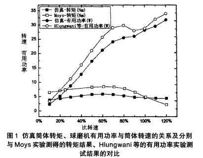 球磨機筒體內壁裝有12個24mm×24mm的矩形襯板,仿真時研磨體填充率為35%,仿真進行了6個筒體運轉周期,且每次仿真時磨機筒體都恒速運轉。研究時,轉矩和有用功率取仿真的 兩個周期的平均值。圖1給出了筒體轉矩和磨機有用功率隨轉速的變化狀況。